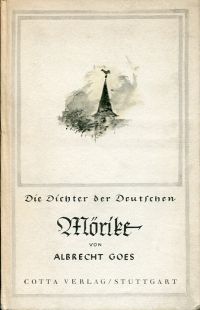 Goes, Albrecht: Mörike 1.– 5. Tsd. Stuttgart: Cotta 1938. 8°. 94 S., 1 Titelbild, Pappband (private Widmung auf Vortitel; Papier leicht gebräunt; leicht angestaubt; sonst altersgemäss gut erhalten) (=Die Dichter der Deutschen ; Folge 2) Text in Fraktur.