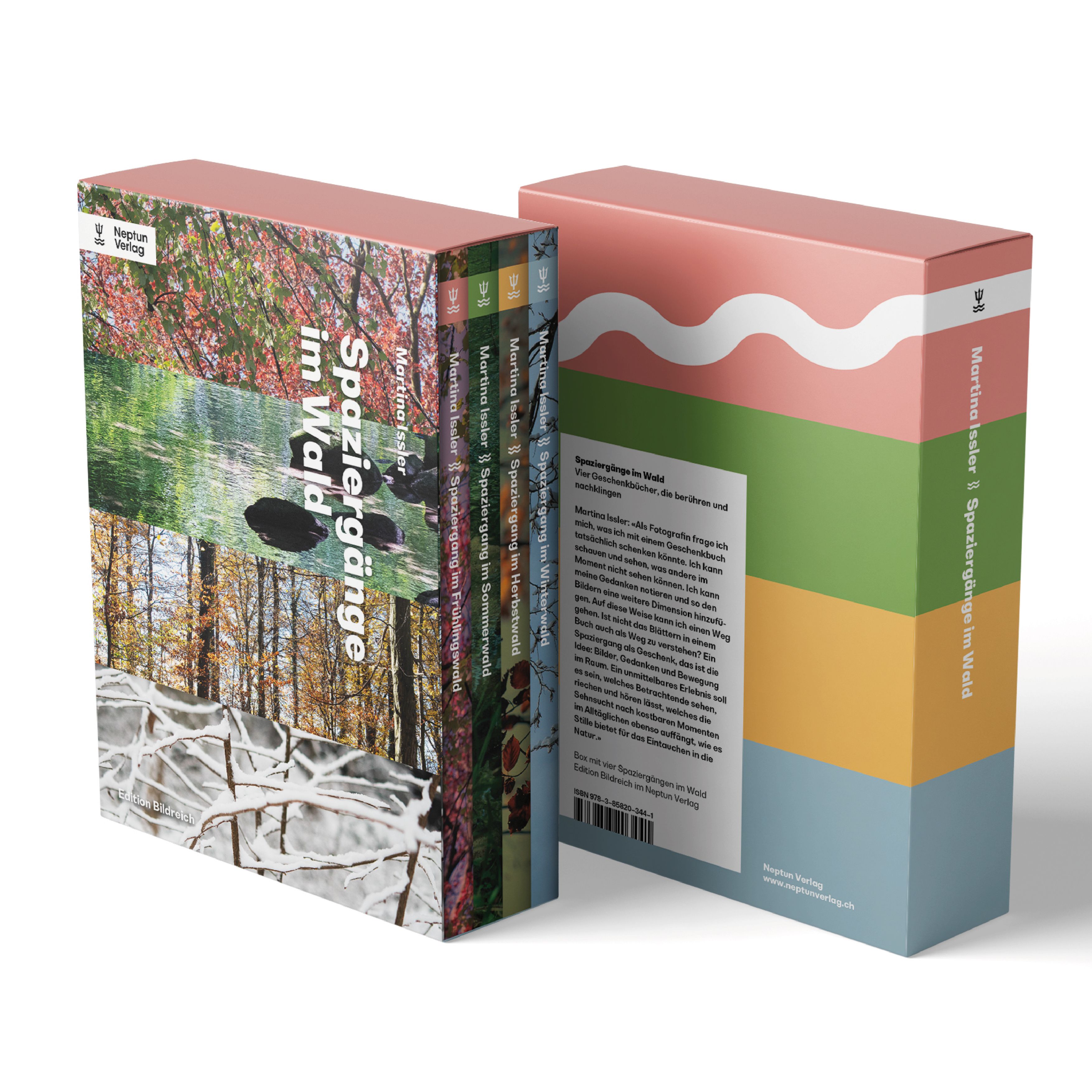 Issler, Martina: Spaziergänge im Wald. Vier Geschenkbücher, die berühren und nachklingen. Edition Bildreich Bern: Neptun 2023. Insgesamt 384 S., durchgehend farbige Fotografien, Schmuckschuber Spaziergänge im Wald Vier Geschenkbücher, die berühren und nachklingen