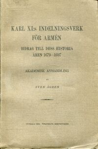 Ågren, Sven: Karl XI’s indelningsverk för armén. Bidrag till dess historia aren 1679-1697. Akademisk avhandling. Uppsala: Wretmans Boktryckeri 1922. Gr.-8°. XVI, 205 S., broschiert (Besitzervermerk auf Vorsatz; altersgemäss gut erhalten)