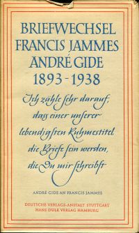 Jammes, Francis/Gide, André: Briefwechsel. 1893 – 1938. Hamburg: Dulk; Stuttgart: Deutsche Verlagsanstalt 1951. 8°. XXVII, 351 S., Faksimiles, Leinen Schutzumschlag mit Randläsuren; Papier altersbedingt leicht gebräunt; altersgemäss gut erhalten)
