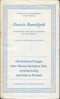Wehrli, Max: Deutsche Barocklyrik. 4., erweiterte Auflage. Basel/Stuttgart: Schwabe 1967. 8°. 254 S., Pappband (Besitzervermerk auf Vorsatz; Schutzumschlag mit leichten Randläsuren und wenig befleckt; sonst gut erhalten) (=Sammlung Klosterberg ; N.F.)