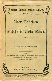 Bornemann, Wilhelm: Vier Tabellen zur Geschichte der Basler Mission. Basel: Verl. der Missionsbuchh. 1902. 16 S. (Umschlag mit kleinen Einrissen und abgegriffen) (=Basler Missionsstudien, 11)