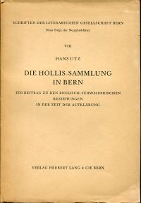 Utz, Hans: Die Hollis-Sammlung in Bern. Ein Beitrag zu den englisch-schweizerischen Beziehungen in der Zeit der Aufklärung. Bern: Lang 1959. Gr.-8°. 148 S. broschiert Seiten nicht beschnitten; sonst gut erhalten) (=Schriften der Literarischen Gesellschaft Bern ; 8)