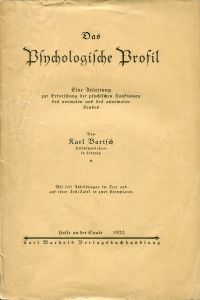 Bartsch, Karl: Das psychologische Profil. Eine Anleitung zur Erforschung der psychischen Funktionen des normalen und des anormalen Kindes. Halle: Marhold 1922. Gr.-8°. 62 S., 101 Abb., 1 mehrf. gef. Test-Taf. in 2 Exemplaren. broschiert Einband mit Gebrauchsspuren, angestaubt und Faltspuren; Seiten nicht beschnitten) Text in Fraktur.