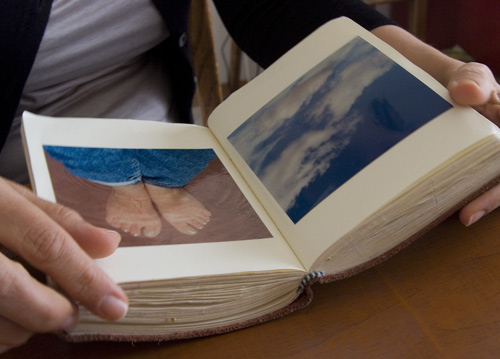 bildreich karten PK 622: zwischen himmel und erde. Querformat. (Hand, Hände, Tagebuch, Foto, Himmel, Füsse, Sand, Jeans, Tisch, lesen, betrachten)