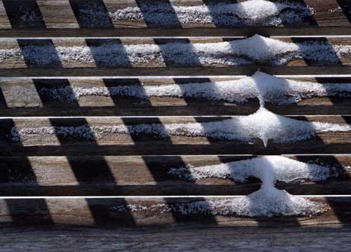 | bildreich karten PK 885: warmer winternachmittag. Querformat. (Schnee, Holz, Bank, Sitzbank, Licht, Schatten) Mindestbestellmenge: 15 Karten (auch assortiert).