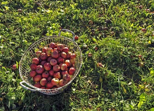 bildreich karten PK 958: saftaepfel. Querformat. (Apfel, Apfelbaum, Garten, Apfelernte, Fallobst, Obsternte, Korb) Mindestbestellmenge: 15 Karten (auch assortiert).