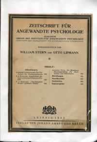 Stern, William/Lipmann, Otto (Hrsg.): Zeitschrift für angewandte Psychologie; zugleich Organ des Instituts für angewandte Psychologie (Instituts der Gesellschaft für Experimentelle Psychologie). Leipzig: Johann Ambrosius Barth 1922. 8°. S. 297-448, broschiert (neuer Einband; aufgeklebtes Titelblatt; Papier gebräunt) Aus dem Inhalt: Langelüddekke, Albrecht: Zur Psychologie des Psychographierens – Rossolimo, G.J.: Ausgleichende Zulagen zu den psychologischen Profilen – Rossolimo, G.J.: „Psychologische Profile“ defektiver Schüler.