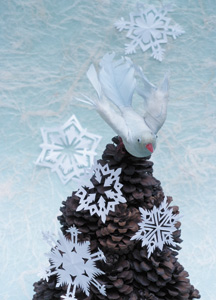 bildreich karten PK 378: jennifers weihnachtsbaum. Hochformat. (Schnee, Eis, Schneesterne, Scherenschnitt, Föhrenzapfen, Vogel, Weihnachtsdekoration, Dekoration)