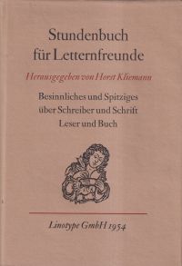 Kliemann, Horst: Stundenbuch für Letternfreunde. Besinnliches u. Spitziges über Schreiber u. Schrift, Leser u. Buch. Berlin/Frankfurt/Main: Linotype 1954. Gr.-8°. 186 S. Leinen (Schutzumschlag mit leichten Randläsuren; gut erhalten) Erschien aus Anlaß d. 100. Geb. d. Erfinders d. Linotype-Setzmaschine Ottmar Merghenthaler