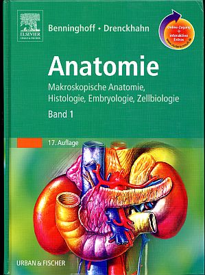 Benninghoff: Anatomie. makroskopische Anatomie, Histologie, Embryologie, Zellbiologie. Mischaufl.17., durchges. Aufl. (Band 1); 16., völlig neu bearb. Auflage (Band 2) 2 Bände. München: Urban & Fischer 2002-2004. Lex.-8°. XI, 956 S., 1082 grösstenteils mehrfarbigen Abbildungen; XII, 876 S., 1295 grösstenteils mehrfarbigen Abbildungen, Pappband (Besitzervermerk auf Vorsatz unkenntlich gemacht; sonst gut erhalten) Band 1: Zellen- und Gewebelehre, Entwicklungslehre, Skelett- und Muskelsystem, Atemsystem, Verdauungssystem, Harn- und Genitalsystem – Band 2: Herz-Kreislauf-System, Lymphatisches System, Endokrines System, Nervensystem, Sinnesorgane, Haut.